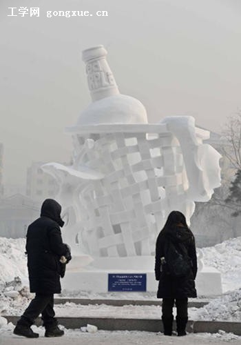 1月7日,两位市民在参观哈尔滨工程大学雪雕作品《遗弃时代》。新华社记者王松摄