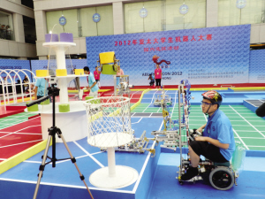 据介绍,比赛选取香港著名的节日“包山节”作为主题设置比赛场景。每组参赛队派出三个机器人,分别是负责指挥全场的“手动机器人”、负责运载协调的“自动机器人”和最终爬上山抢“包子”的“采集机器人”。别看这些机器人跑起来轻松,每个机器人都足有四五十斤重。首场比赛由北京交通大学对阵去年全国赛冠军华中科技大学。在“抢包子”的过程中,“采集机器人”须伸展手臂采集三种不同颜色的“包子”,并投入指定的篮筐,只见华中科技大学几次投篮失败,最终在2分30秒时成功获取三色“包子”。此时距离比赛结束时间仅剩30秒,而对手代表队则在翻越障碍中途遭遇机器人罢工,无奈中途退场。