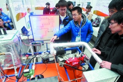 图为参赛选手在展示自己制作的“沼气热泵系统”。本报记者 李巍 摄