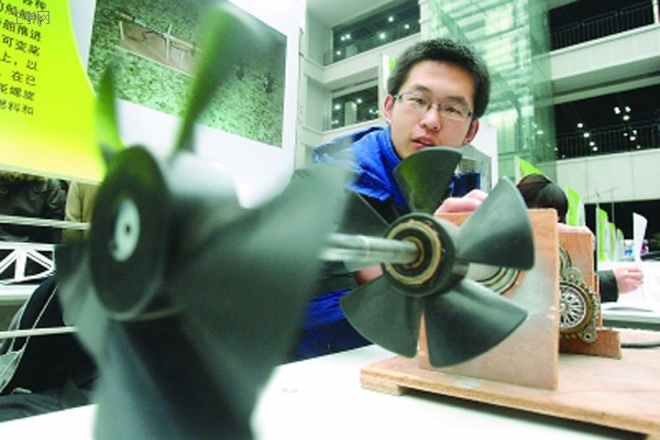 一名参赛选手展示具有降噪、节能、高效特点的双螺旋桨船舶推进器。