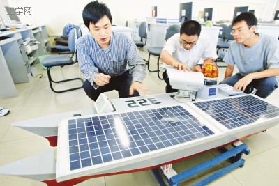 3日,在哈尔滨工程大学的试验室内,技术人员正在调试一种新型的水上探测船,该船长约1.5米,为双体结构,可抵御较大风浪,以太阳能为动力,具有环保功能,船身安有摄像头、水样抽取器等设备。