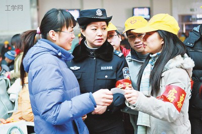 6日上午,在哈尔滨火车站候车室,10名戴着志愿者小黄帽的大学生正在协助民警开展春运客票调查活动。他们通过了解旅客客票来源、票价,协助警方随时掌握管区内不法售票情况,保证春节和大冬会期间广大旅客免受不法侵害。