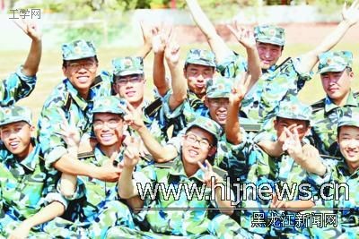 27日,在哈尔滨工程大学的操场上,来自四川广汉市高坪镇龙潭村的曾跃胜正在参加学校组织的军训。他个头不高,黑黑的脸庞上架着近视镜。训练中他努力做好每一个动作,汗水湿透了衣襟。