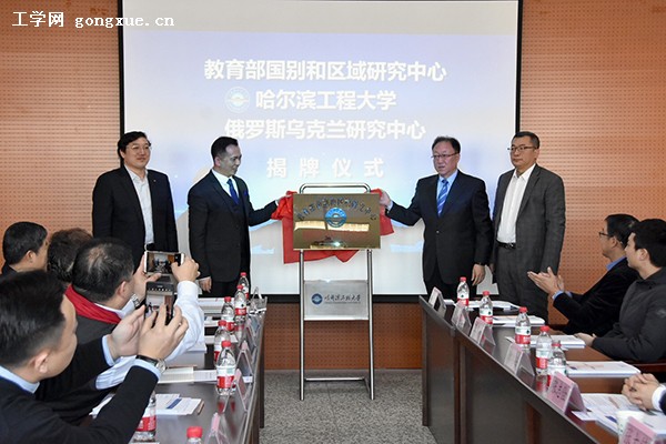 张大铸,都书峰,我校经管学院院长尹航,俄罗斯乌克兰研究中心学术主任、首席专家高天明共同为哈尔滨工程大学俄罗斯乌克兰研究中心揭牌。高天明还在会上作了中心成果推介报告——《中俄北极开发合作报告2018》。