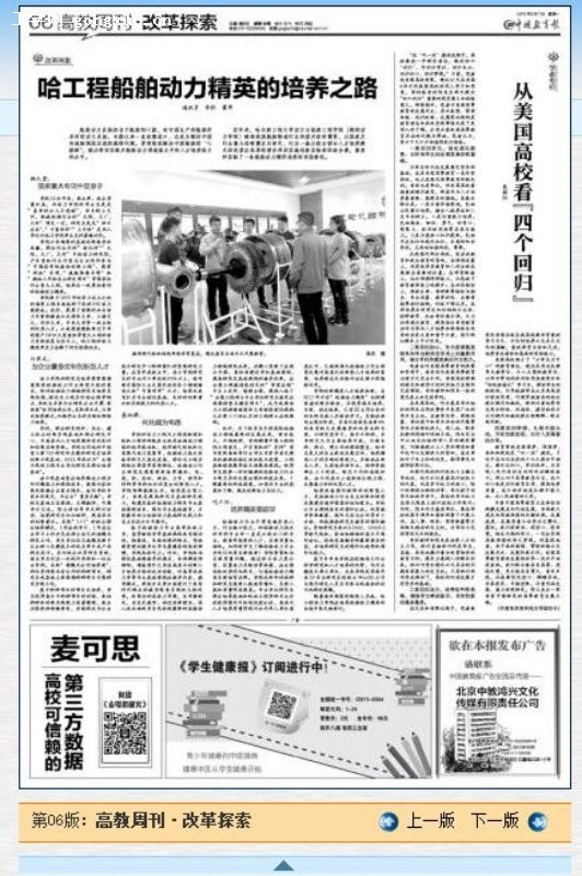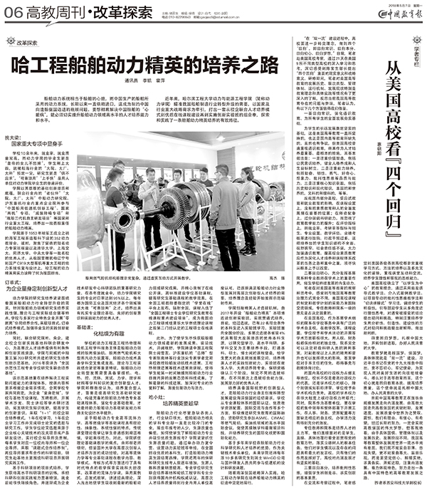 5月7日《中国教育报》第六版“高教周刊改革探索”专版,以《哈工程船舶动力精英的培养之路》为题,报道了我校动力学院船舶动力精英人才培养的有效路径。