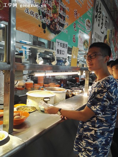 熟悉了洗漱间、开水间、洗衣房的位置,午餐时间,张元哲迫不及待地要去食堂犒劳自己的胃,来碗热气腾腾的“下车面”暖心又暖胃,张元哲请师兄为他记录下食堂第一次用餐的“历史时刻”。未来的四年,想到能够在学校吃到祖国四海的美食,还有那家乡味道的河南烩面,张元哲脸上露出美滋滋的笑容。