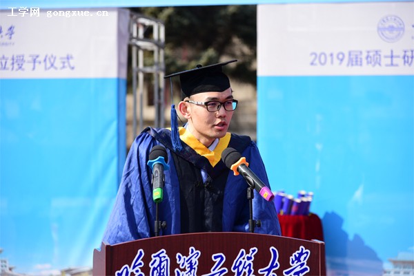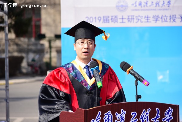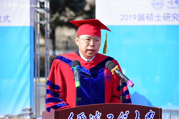 吴林志发表致辞,寄语2019届硕士毕业生“做一名追求卓越的有为青年”。他说,祝贺同学们顺利完成学业,满载收获与荣耀踏上人生新征程!希望同学们牢记“大工至善、大学至真”的校训,争当建成社会主义现代化强国,实现中华民族伟大复兴的中国梦的奋斗者和实干家,肩负起新时代赋予青年的重任。他勉励毕业生:一是要有坚定的理想信念,秉承学校自“哈军工”以来积淀的大学精神与文化特质,拥有“天下兴亡,匹夫有责”的使命感,不忘初心,始终把自己的理想同祖国的前途、把自己的人生同民族的命运紧密联系在一起,扎根人民,奉献国家,在报效祖国、服务人民中展现青春作为、展示人生价值,在执着奋斗、坚定前行中一步一个脚印实现人生理想、成就个人梦想。二是要练就过硬的本领,将学习作为一种责任,作为一种精神追求,作为一种生活方式,勤于学习、善于学习,永不僵化、永不止步,早日成为新时代新航船的合格“水手”,争做中国特色社会主义事业的建设者和接班人。三是要学会自律与坚持,将其作为一种不可或缺的人格力量,战胜平庸的最好武器,给自己一份约束,让自己多一分坚持,始终坚信,“当我自律,人生无敌”。他最后表示,希望同学们记住母校的大楼和军号,祝愿同学们在未来的征程中一切顺利、鹏程万里、大有作为!