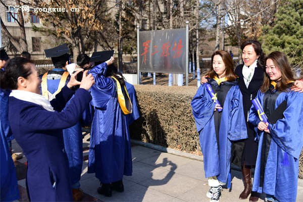 出席仪式的校领导、校学位评定委员会委员、各学院院长为每位硕士研究生颁授学位证书、援正流苏并合影留念。