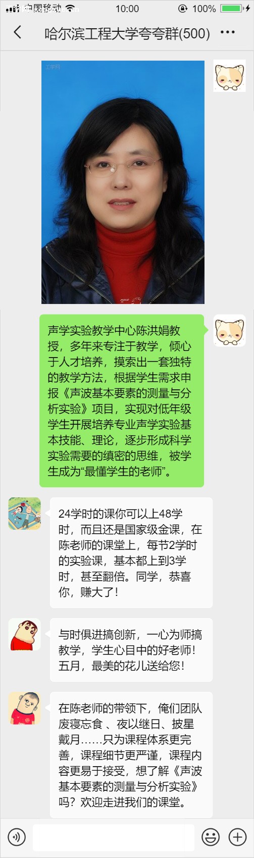 陈洪娟老师秉承水声人“为船为海为国防,做人做事做学问”的理念,关心大学生成长,关注本科生教学,从学生入校便打下良好的专业基础,她所带领的团队,立项“声波基本要素的测量与分析实验”,2018年入选国家虚拟仿真实验教学项目。