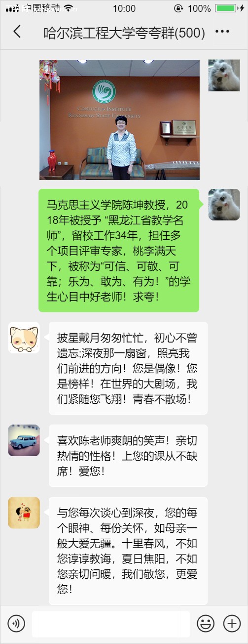 爽朗的笑声、亲切的言语、热情的性格,陈坤老师鲜明的个性在多年的执教生涯中,感染着每个学生,她治学严谨的精神、为人处世的大度、宽厚爽朗的性格,为学生们树立了人民教师的光辉形象,“黑龙江省教学名师”奖实至名归。