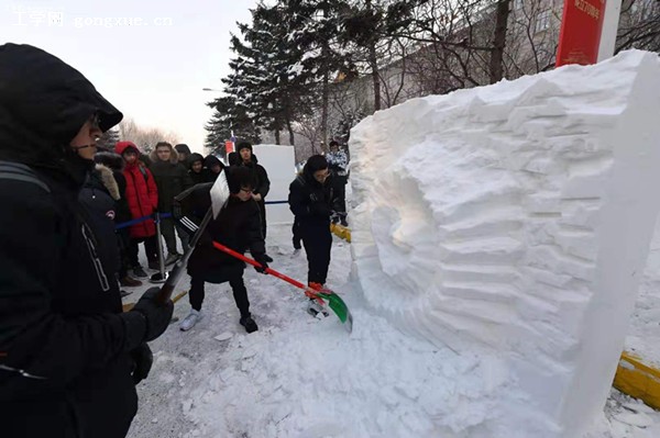 开幕式现场,机电学院雪雕工作室张宇老师带领李秘胤、付金池、薄国庆三位同学,在长2米、宽1米、高2米的人造雪块上雕刻速雕作品《优美的螺线——车轮螺》。仅在30分钟的时间内,队员们迅速将雪块打造成精美的雕塑作品,尽显雪雕活动的魅力,吸引场外群众围观。