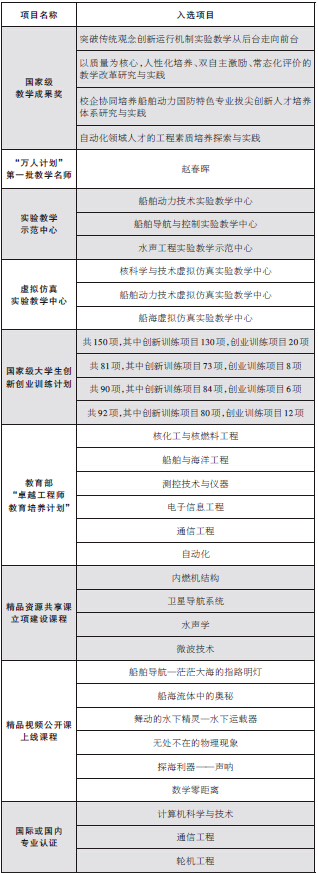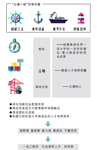 突出人才培养中心地位,培养具有国际视野的高水平创新型人才,支撑创新型国家建设,服务造船强国、海洋强国、核工业强国建设和大国地位实现;培养一批“一带一路”沿线国家“知华派”留学生,服务于高端产品出口和大国软实力建设。强化人才培养质量意识和“三海一核”特色属性,以成长潜力和创造力为核心目标,深化教育教学改革和质量保障机制建设,形成结构合理、满足需求、富有活力的高水平特色人才培养体系。