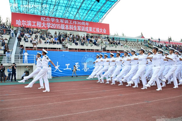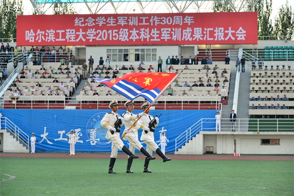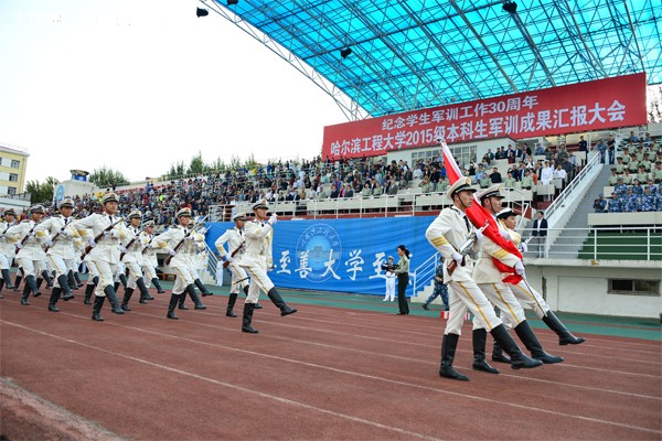 军训团进行了一系列经典、精彩的军训科目表演。参训学员以严整的军容、整齐有力的动作,虎虎生威地表演了擒敌拳。在随后进行的女子连队列表演中,女兵组成了2015、舵轮、我校英文缩写HEU等图案。