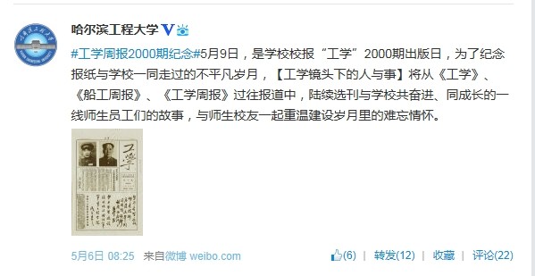 学校官方微博在新浪、腾讯两大平台上发起微话题#工学周报2000期纪念#,以“工学镜头下的人与事”为主题,从《工学》、《船工周报》、《工学周报》过往报道中,陆续选刊与学校共奋进、同成长的一线师生员工们的故事,与师生校友一起重温建设岁月里的难忘情怀。下文节选部分官博与校友互动内容。