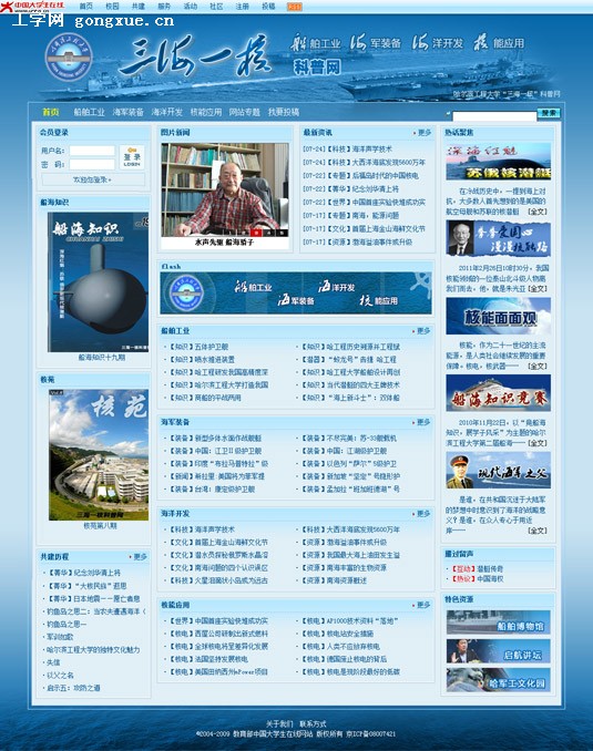 “三海一核”科普网由校网络宣传中心与中国大学生在线共建,是工学网旗下107个子网站之一。网站立足我校“三海一核”优势办学资源,设置“船舶工业”、“海洋开发”、“海军装备”和“核能应用”等主要栏目,以“史述、科技、热点”的发展视角,以热点专题与群组讨论相结合、电子杂志与线上推广相结合的运行模式,专业解读科技前沿,聚焦透析行业热点,浓缩绘制了一幅“三海一核”行业进程、科技发展的画卷。网站内容特色鲜明,推出的专题全部被中国大学生在线推荐到网站首页阅读,创下了最长连续推荐40天的佳绩。