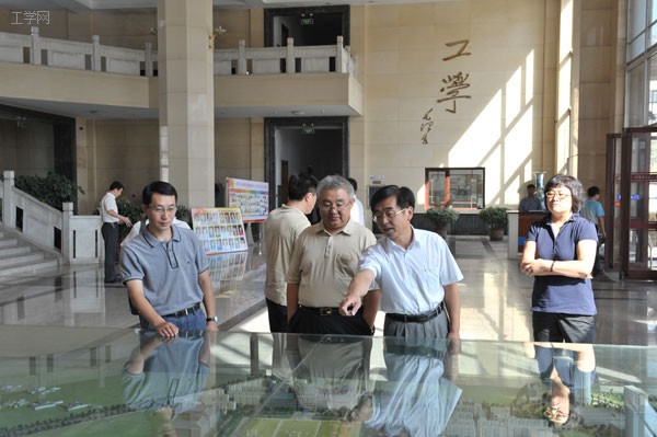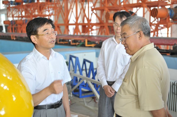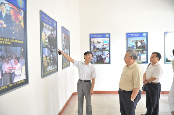 杨再兴一行在校领导刘志刚、张文平的陪同下,考察参观了我校校园规划沙盘、深水水池、41号楼实验室、船舶博物馆、陈赓纪念展等。