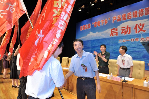 刘志刚致欢迎辞。他代表学校热烈欢迎各位领导和来宾的到来,向活动的举办表示祝贺。他说,我校历来高度重视社会实践在大学生成长成才中的重要作用。每年大约有5000余名学生到农村、到企业开展社会实践活动。这次部属高校“家电下乡”产品售后维修服务暑期社会实践调查活动的开展有利于大学生了解社会、认识国情、增长才干、锻炼毅力,有利于推动大学生素质拓展,有利于增强学生的历史使命感和社会责任感。他表示,在工信部的正确领导下,在七所高校的通力协作下,在广大学生的积极参与下,本次社会实践活动一定会为推动“家电下乡”政策的落实做出积极的贡献。