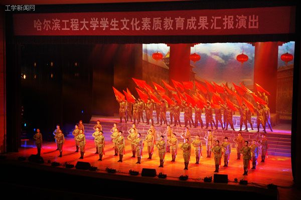在大型合唱歌舞《哈尔滨工程大学校歌》声中,演出圆满结束。演出结束后,专家和领导走上舞台,与学生演员一一握手,亲切交流。