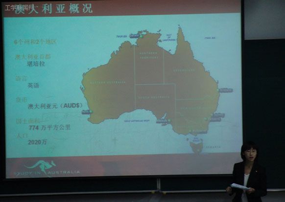 澳大利亚驻华大使馆教育科学与培训处高级主管10月16日晚在N201大教室为国际合作教育学院2005级、2006级中澳合作教育项目学生讲解赴澳留学政策以及申请留学签证事宜。