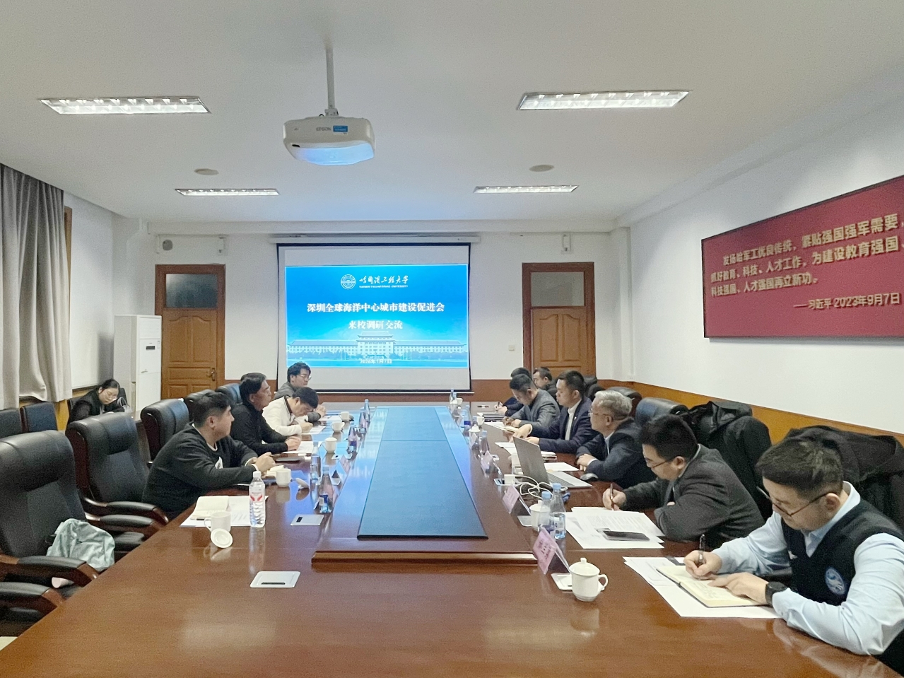 1月7日,深圳全球海洋中心城市建设促进会会长杨洪一行5人来校调研。校党委副书记、校长殷敬伟出席座谈会,双方围绕深化产学研合作等方面展开座谈交流。党委常委、副校长韩端锋陪同调研和座谈。