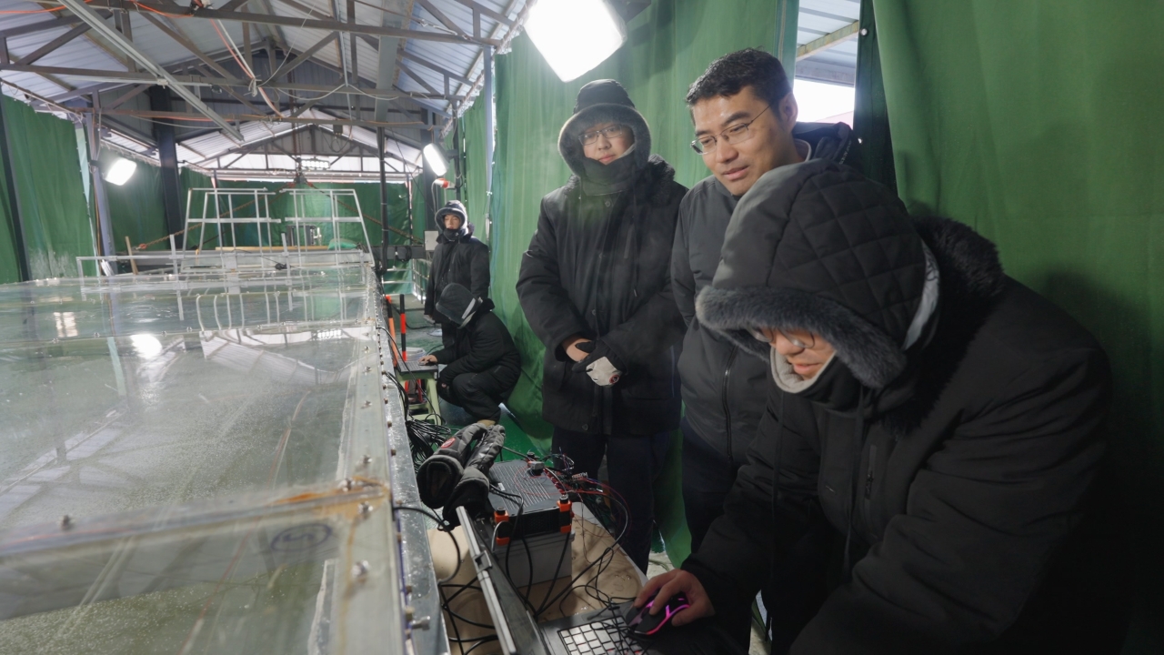 团队博士生孙林华:2025年哈尔滨的冬天来得有点晚。进入12月,我天天盼着温度快点降,越冷越好,这样冰水池就能快点结冰,我们就能多做试验了。我们几乎整个冬天都泡在实验室里。每天早上7点不到就开始做准备工作:清理前一天晚上冻得太厚的冰层,等待新的冰块形成。为了在这个季节多获取几组数据,我们就尽量多做几组试验,常常忙到半夜。