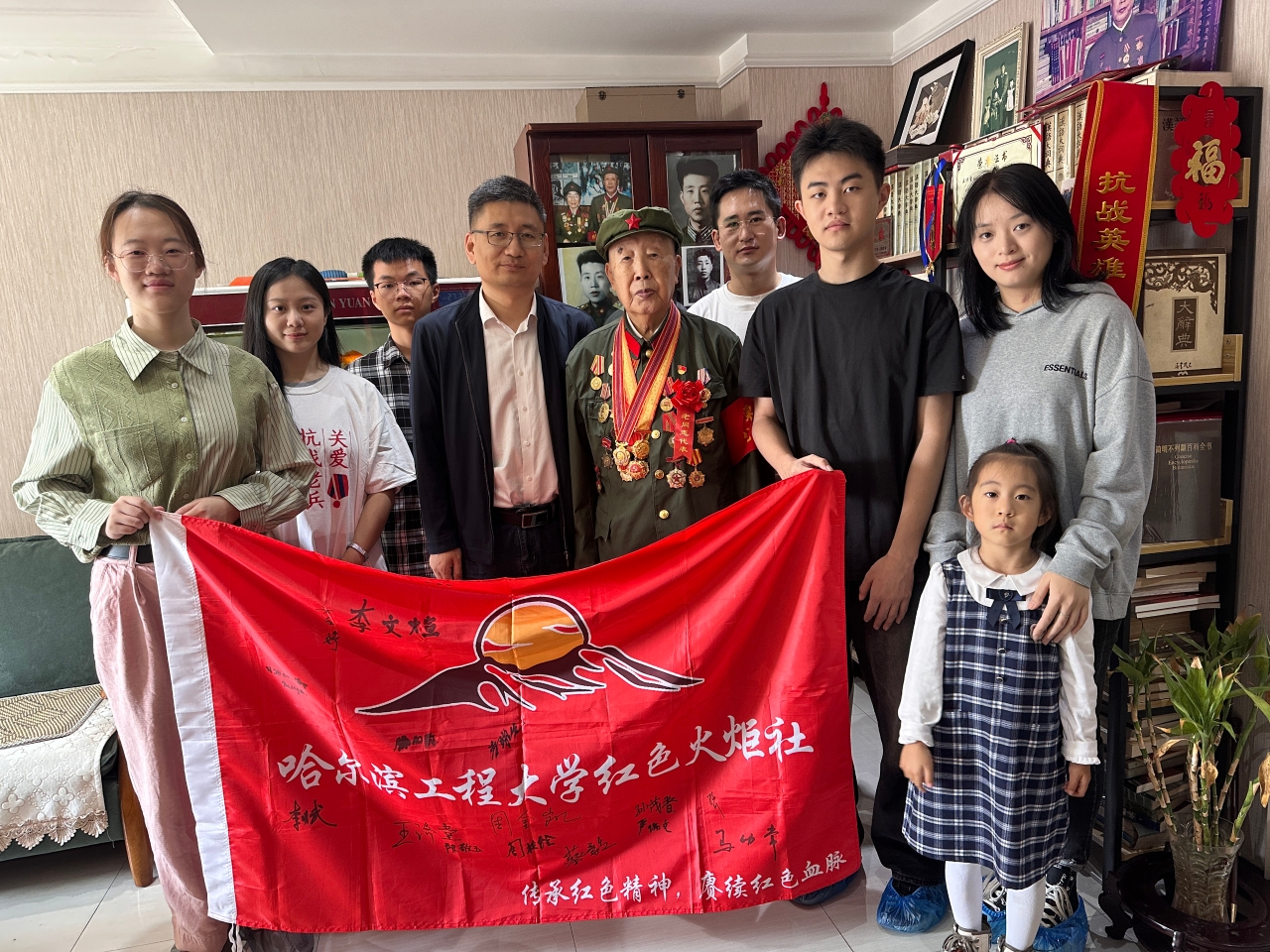 烛光轻轻摇曳,映照着志愿军老战士陈敬玉奶奶眼角细密的纹路。奶奶今年97岁了,曾是抗美援朝战场上的一名医护兵。她望着我们红色火炬社的几名同学为她准备的生日蛋糕,眼里泛起温暖而湿润的光,缓缓谈起讲起自己17岁参军、在朝鲜战场上驻扎在山洞里救护伤员的往事,语气平缓得像在聊家常。那一刻我忽然明白,历史从未走远,它就藏在这样的讲述中、这样一双曾经挽救过生命的手中。作为红色火炬社的社长,我跟随李世辉老师拜访过不少像陈奶奶这样的老兵。每一次探望,都不只是简单的慰问,而是一场跨越岁月的对话——我们在聆听中打捞即将沉没的记忆,在陪伴中传递未曾褪色的敬意。