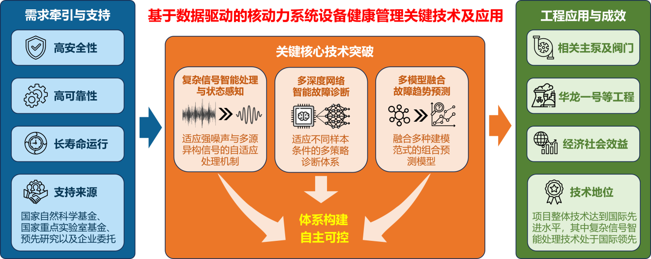 该项目围绕我国核能动力重大工程需求,针对装备全寿期自主可控智能运维中的关键问题深入研究,成功突破了一系列技术难题,建立起一套自主可控的系统设备健康管理技术体系,实现了对核动力装置设备全生命周期的智能监测与维护。该成果已成功应用于“华龙一号”等核工程中,提升了核动力装置的运行安全性与可靠性,产生了良好的经济效益,具备广泛的市场应用前景。
