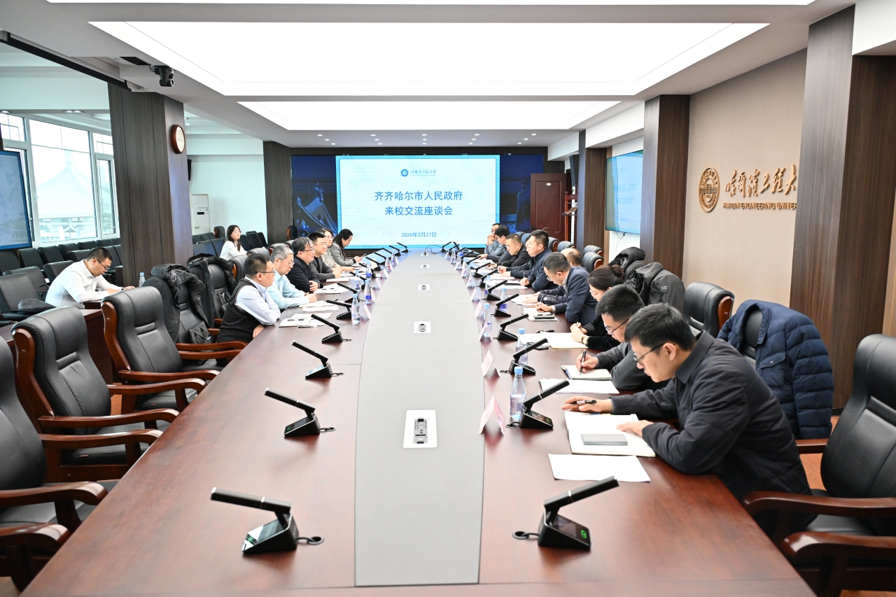 2月27日,齐齐哈尔市委常委、副市长谭绪东一行7人来校调研。校党委副书记、校长殷敬伟会见来访客人,双方就深化全面合作开展座谈交流。校长助理陈海龙陪同。