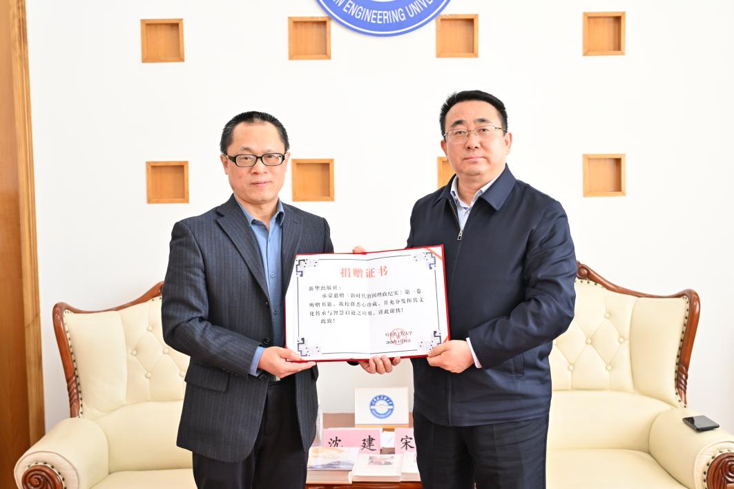 沈建代表新华出版社向学校赠送《新时代治国理政纪实》第一卷及《中华人民共和国年鉴》英文版,宋迎东代表学校向沈建颁发捐赠证书。