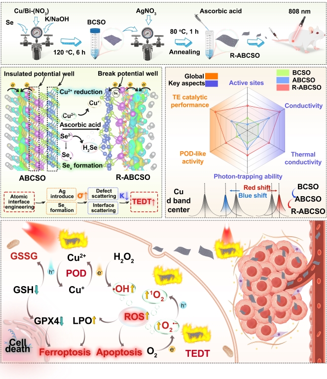 在近红外激光照射下,这种新型纳米材料能够高效吸收光能并转化为热量,快速加热局部肿瘤区域。温度梯度进而激发出强烈的热电效应,在材料内部产生电场,驱动电子和空穴高效分离。与此同时,材料中的铜离子还具备类似天然酶的活性,能够催化肿瘤内过量的过氧化氢生成强氧化性的活性氧,并消耗肿瘤细胞的抗氧化保护剂——谷胱甘肽,从而破坏肿瘤的防御系统。就这样,光热效应、热电催化和酶催化三者协同作战,“三管齐下”持续放大杀伤信号,使肿瘤细胞无处可逃。