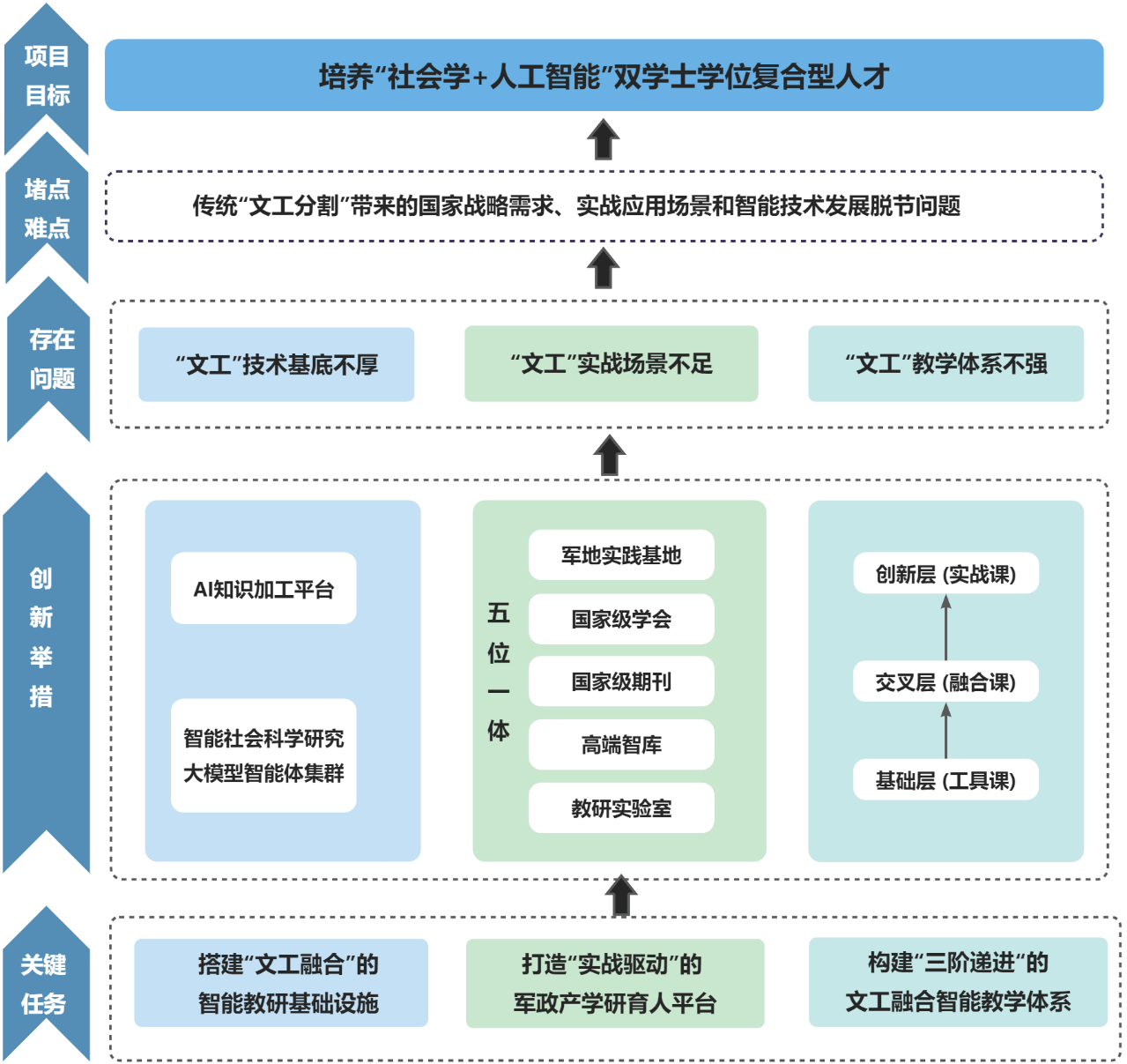 “社会学+人工智能”双学士学位复合型人才培养项目依托学校“社会学”与“智能科学与技术”两个一级学科博士点进行建设。该项目定位精准、特色鲜明,以雄厚的师资力量、扎实的学科基础、先进的人才培养体系、高水平的教学科研平台,积极响应国家“人工智能+X”战略,摒弃“课程拼盘”模式,旨在培养真正掌握“文工交叉”思维的“双栖”人才。项目注重将数学、社会统计学、人工智能基础及社会学专业知识,用于解决复杂的社会治理与社会计算问题,将抽象的社会理论转化为可计算的数学模型,实现专业优势互补,推进全价值链双向促进的培养过程。