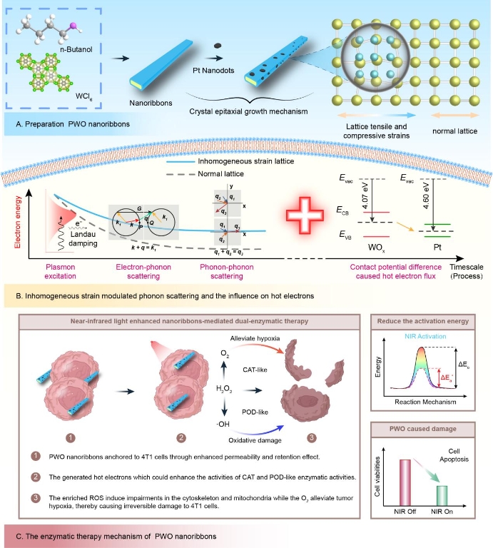 用于酶治疗的 PWO 纳米带的制备工艺示意图及其不均匀应变调制声子散射机制
