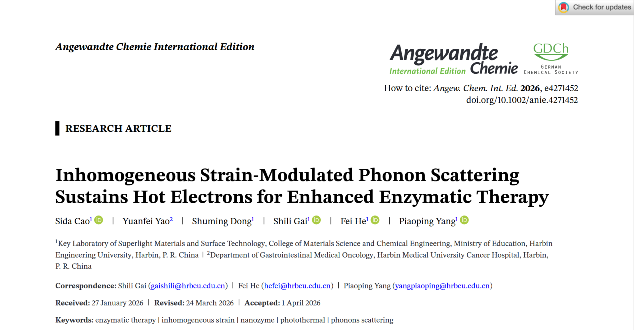 相关成果以“非均匀应变调制声子散射维持热电子用于增强酶治疗”为题,发表在国际顶级期刊《德国应用化学》。哈尔滨工程大学为论文第一完成单位,材化学院博士生曹思达为第一作者,盖世丽教授、贺飞教授、杨飘萍教授为通讯作者。