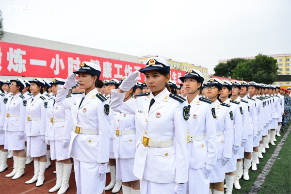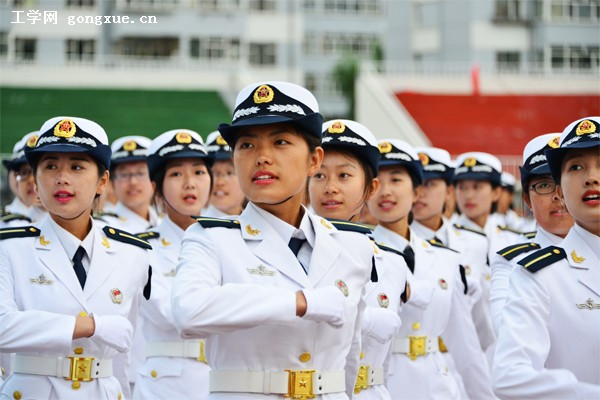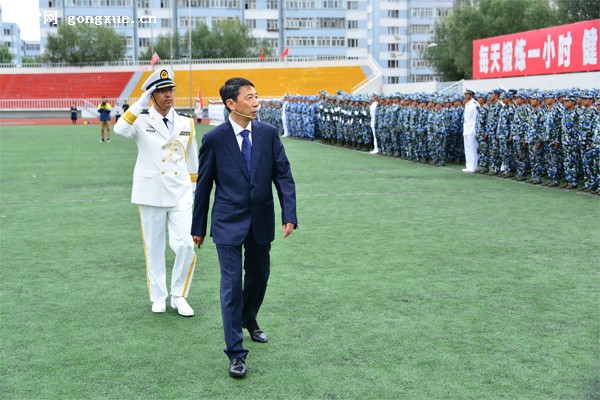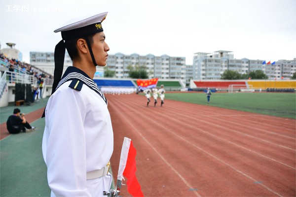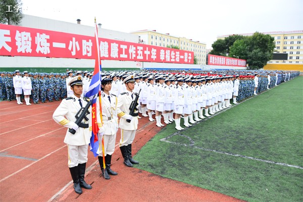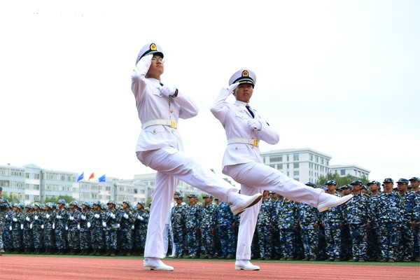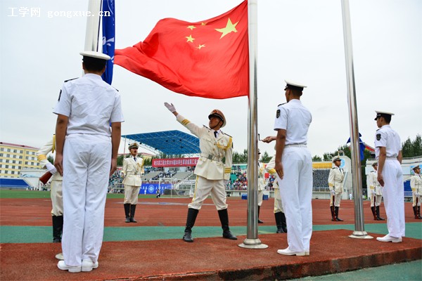 16时,军号准时吹响。海军国防生国旗护卫队入场,升校旗,唱校歌。