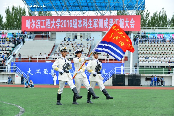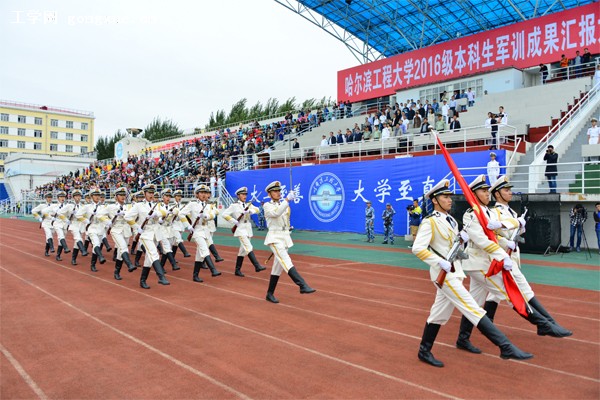 军训团进行了一系列经典、精彩的军训科目表演。在女子连队列表演中,女兵组成了我校英文缩写HEU、2016、舵轮等图案。随后,三营的300名学生、四营的400名学生组成的表演方阵,分别以严整的军容、整齐有力的动作,虎虎生威地表演了刺杀操和擒敌拳。