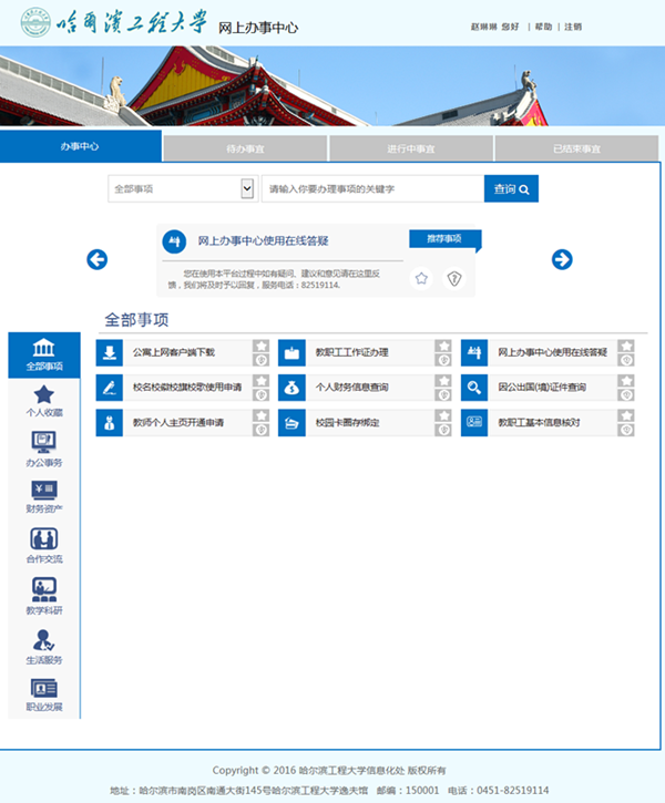 与此同时,借助新版“办公信息网”上线试运行之际,网上办事中心网站系统也正式上线(http://one.hrbeu.edu.cn),“网上办事中心”支持互联网、校园网等多种方式访问,为教职工提供教学科研、职业发展、办公事务、合作交流、财务资产及生活服务,为学生提供学习学术、社团科创、学生事务、合作交流、财务奖助及生活服务。“网上办事中心”是学校推进“互联网+校园服务”,以及深化简政放权、信息公开、优化服务和效能监督的重要举措,提高了机关部门办事效率和透明度,变“师生跑腿”为“数据跑腿”、变“师生四处跑”为“部门协同办”。学校将继续积极推进“线上办理、线下取件”的服务模式,努力实现“线上线下一体化”交互服务。