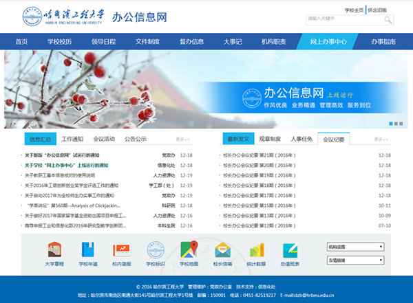 在栏目设置上,新版“办公信息网”结构布局合理、分类清晰明确、内容更加全面,导航栏处设置学校校历、领导日程、文件制度等8个栏目,网站主体部分下设师生最常用的两个栏目信息汇总,包含工作通知、会议活动、公示公告子3个栏目;最新发文包含规章制度、人事任免、会议纪要3个子栏目;而网页低端则各具特色的图标的方式展示了大学章程、学校年鉴、校内简报、学校标识、学校地图等8项功能。