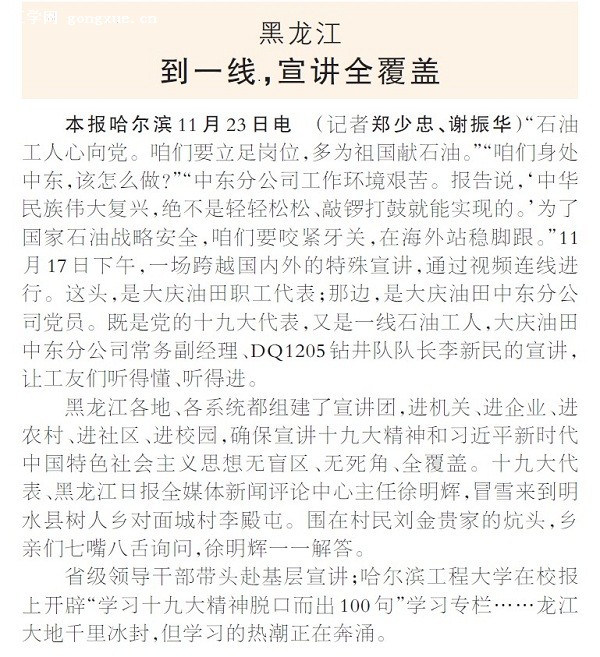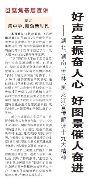 24日出版的《人民日报》要闻第4版,以《好声音振奋人心 好图景催人奋进》为题,持续报道湖北、湖南、吉林、黑龙江等地认真学习宣传贯彻党的十九大精神系列活动。其中“哈尔滨工程大学在校报上开辟‘学习十九大精神脱口而出100句’”学习专栏,作为基层宣讲典型写入龙江篇章。