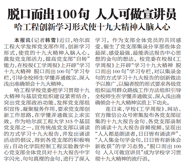 在学习党的十九大精神过程中,哈尔滨工程大学自动化学院控制工程实验教学中心党支部提出集录分享党的十九大报告金句的想法,校党委在校报《工学周报》上开辟“学习十九大精神脱口而出100句”学习专栏,对以集录金句的方式学习十九大报告的创新做法予以推广,以编者按的形式要求各级党组织运用群众路线工作方法组织引导全校师生在学懂弄通做实、深入浅出准确领会十九大精神实质上下功夫。